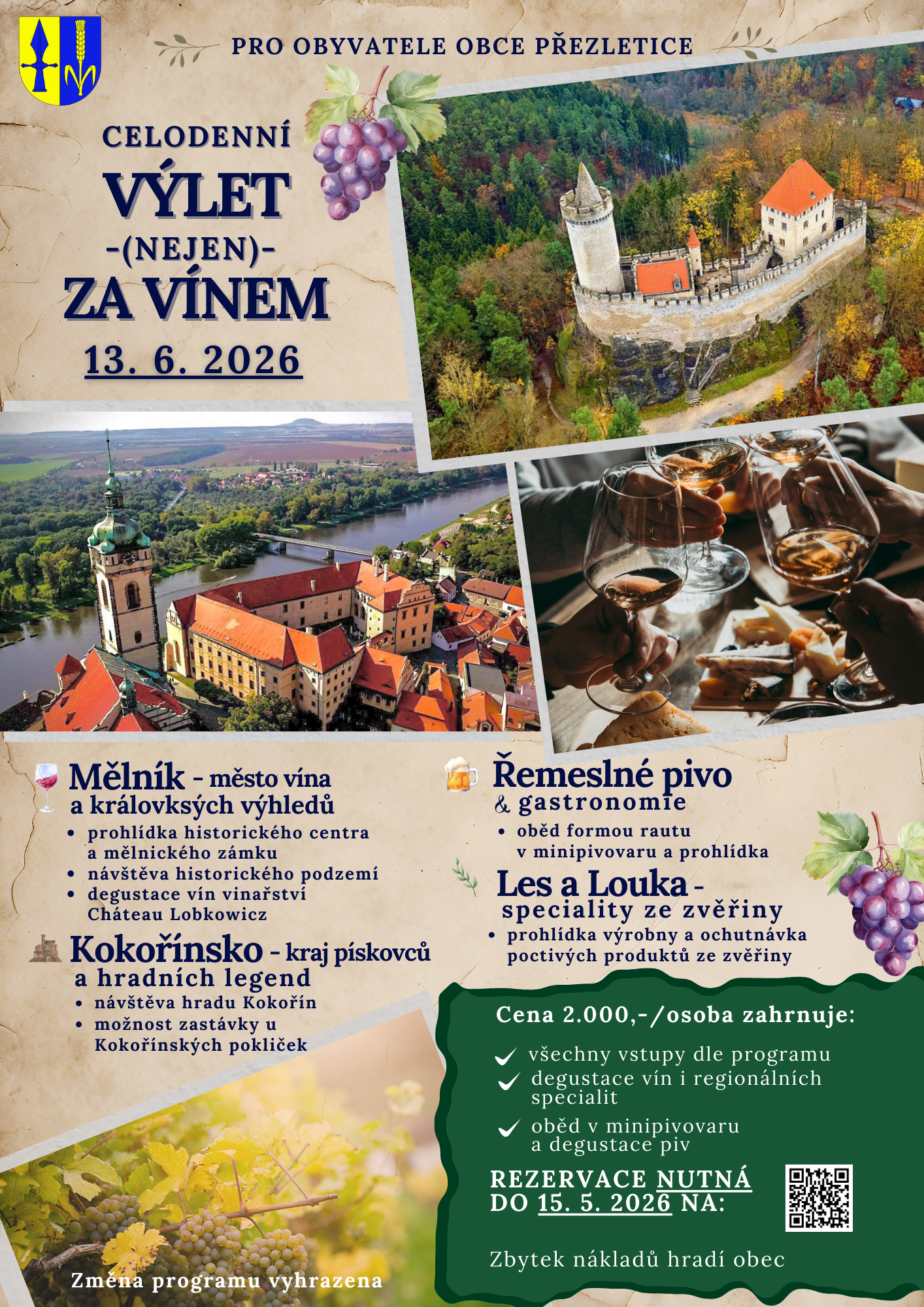 🍇 Celodenní výlet (nejen) za vínem už letos v červnu! Obec Přezletice zve všechny obyvatele na jedinečný výlet plný chutí, zážitků a krásných výhledů. Společně se vydáme do malebného Mělníka, projdeme se historickým centrem i podzemím a ochutnáme vína ve vinařství Château Lobkowicz. Chybět nebude ani návštěva Kokořínska s ikonickým hradem Kokořín. Těšit se můžete také na poctivou gastronomii – oběd v minipivovaru spojený s degustací piva a návštěvu Lesa a Louky s ochutnávkou specialit ze zvěřiny. 📅 Termín: 13. 6. 2026 💰 Cena: 2 000 Kč / osoba (zbytek nákladů hradí obec) Kapacita je omezená, proto neváhejte s rezervací. Čeká vás den plný pohodové atmosféry, dobrého jídla a pití i krás přírody a historie. https://komunitni-centrum-zlatak.reenio.cz/cs/terms kultura@prezletice.cz