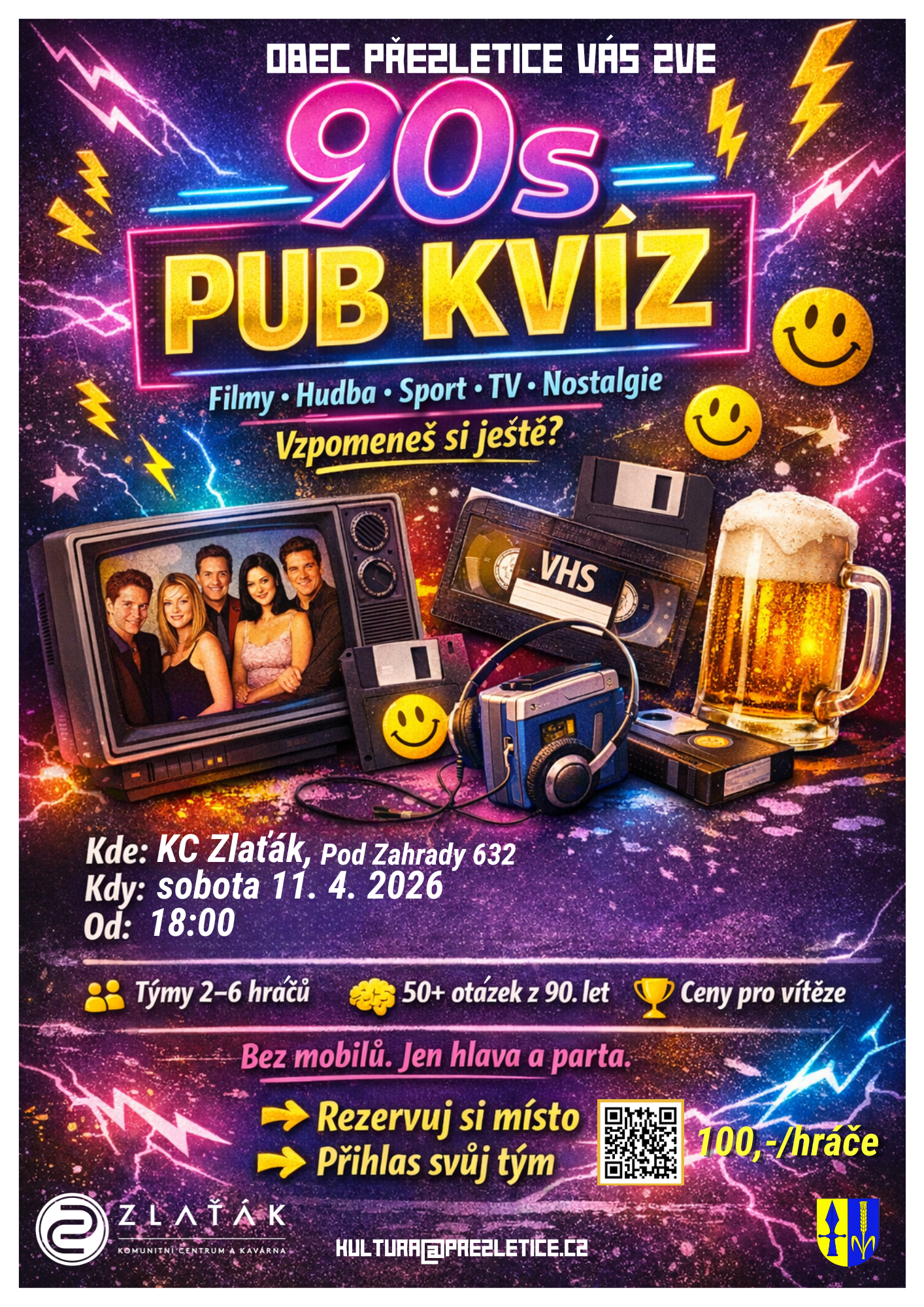 🔥🎉 Připravte se na největší 𝙋𝙐𝘽 𝙆𝙑𝙄́𝙕 letošního jara!!! 𝙋𝙤𝙟𝙙̌𝙩𝙚 𝙨𝙚 𝙨 𝙣𝙖́𝙢𝙞 𝙫𝙧𝙖́𝙩𝙞𝙩 𝙙𝙤 𝟵𝟬𝙨! 🎉🔥 Pamatujete si VHSky, walkmany, první seriálové lásky a hity, co jely z kazet dokola a přetáčely jsme je na tužce? 📼🎧 Teď máte šanci to všechno znovu zažít… a ještě u toho vyhrát! 💥 90s PUB KVÍZ v KC Zlaťák 🗓 Sobota 11. 4. 2026 od 18:00 🍻 Čeká na vás večer plný nostalgie, smíchu a pořádné soutěžní atmosféry: 🧠 50+ otázek ze světa filmů, hudby, sportu i televize 👥 týmy 2–6 hráčů 🏆 ceny pro vítěze 🚫 bez mobilů – jen hlava, paměť a sehraná parta! 💸 Startovné 100 Kč / hráče ⚡️ Sestavte tým, oprašte vzpomínky a dokažte, že devadesátky máte v malíku! 👉 Rezervujte si místo včas – kapacita je omezená! https://komunitni-centrum-zlatak.reenio.cz/cs/terms Tohle nebude jen kvíz, tohle bude návrat do doby, kdy všechno začínalo… 😎✨ kultura@prezletice.cz
