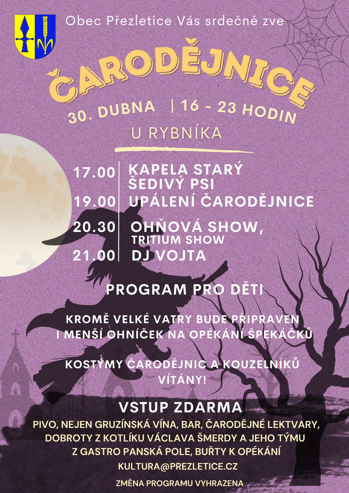 Srdečně vás zveme ve 𝙘̌𝙩𝙫𝙧𝙩𝙚𝙠 𝟯𝟬. 𝙙𝙪𝙗𝙣𝙖 na přezletické pálení čarodějnic u rybníka, kde nás čeká odpoledne i večer plný hudby, ohně, dobrého jídla a pohodové atmosféry. Těšit se můžete tradičně na kapelu 𝙎𝙩𝙖𝙧𝙮́ 𝙨̌𝙚𝙙𝙞𝙫𝙮́ 𝙥𝙨𝙞, upálení čarodějnice vyrobenou dětmi z MŠ Přezletice, ohňovou show od Tritium Show a ve večerních hodinách na 𝘿𝙅 𝙑𝙤𝙟𝙩𝙪. Chybět nebude ani občerstvení – alko i nealko pivo poteče z pěti kohoutů, ochutnat můžete nejen gruzínská vína, čarodějné lektvary, dobroty z kotlíku Václava Šmerdy a jeho týmu z Gastro Panská Pole a k prodeji budou i buřty k opékání. Přijďte si užít kouzelný podvečer i večer s rodinou, přáteli a sousedy. Těšíme se na vás u rybníka. Vstup zdarma kultura@prezletice.cz